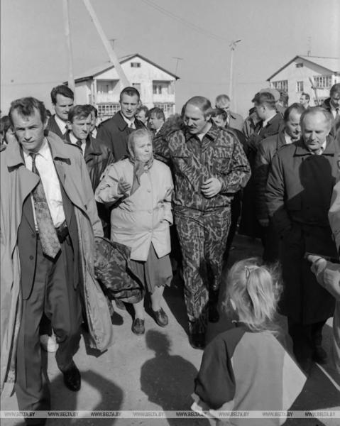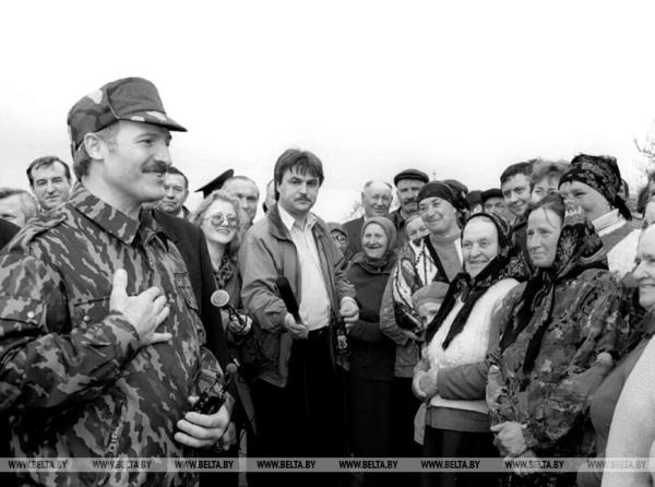 Александр Лукашенко во время посещения поселка переселенцев в деревне Свенск Славгородского района, 1996 год. Фото из архива